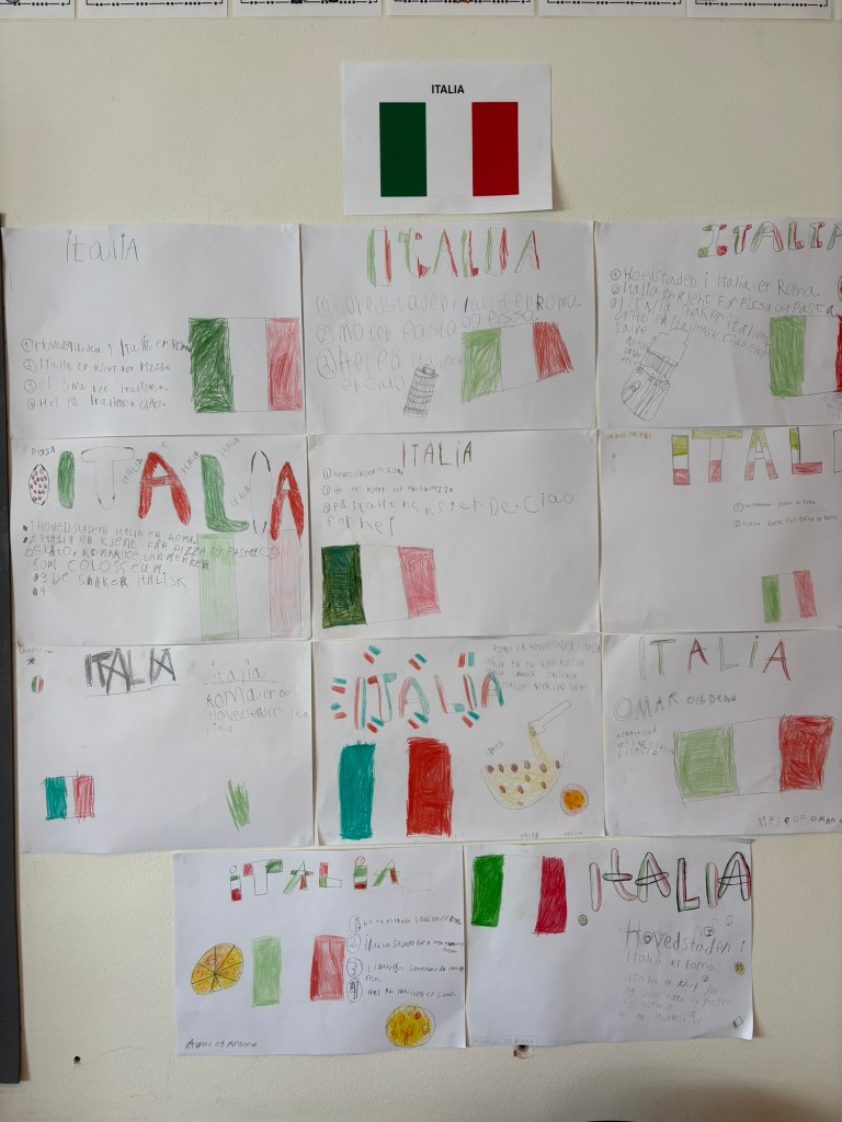 Deretter var de med og stemte frem tre ulike land de ønsket å lære mer om. Deretter hadde de en kort forelesning om landet, før de jobbet med landene på ulike måter for å lære mer. Elevene har blant annet lagd plakater om Italia, bok i bookcreator om Danmark, samt bygd skulptur til Legoland, lagd budsjetter og hatt stasjoner om Mexico.