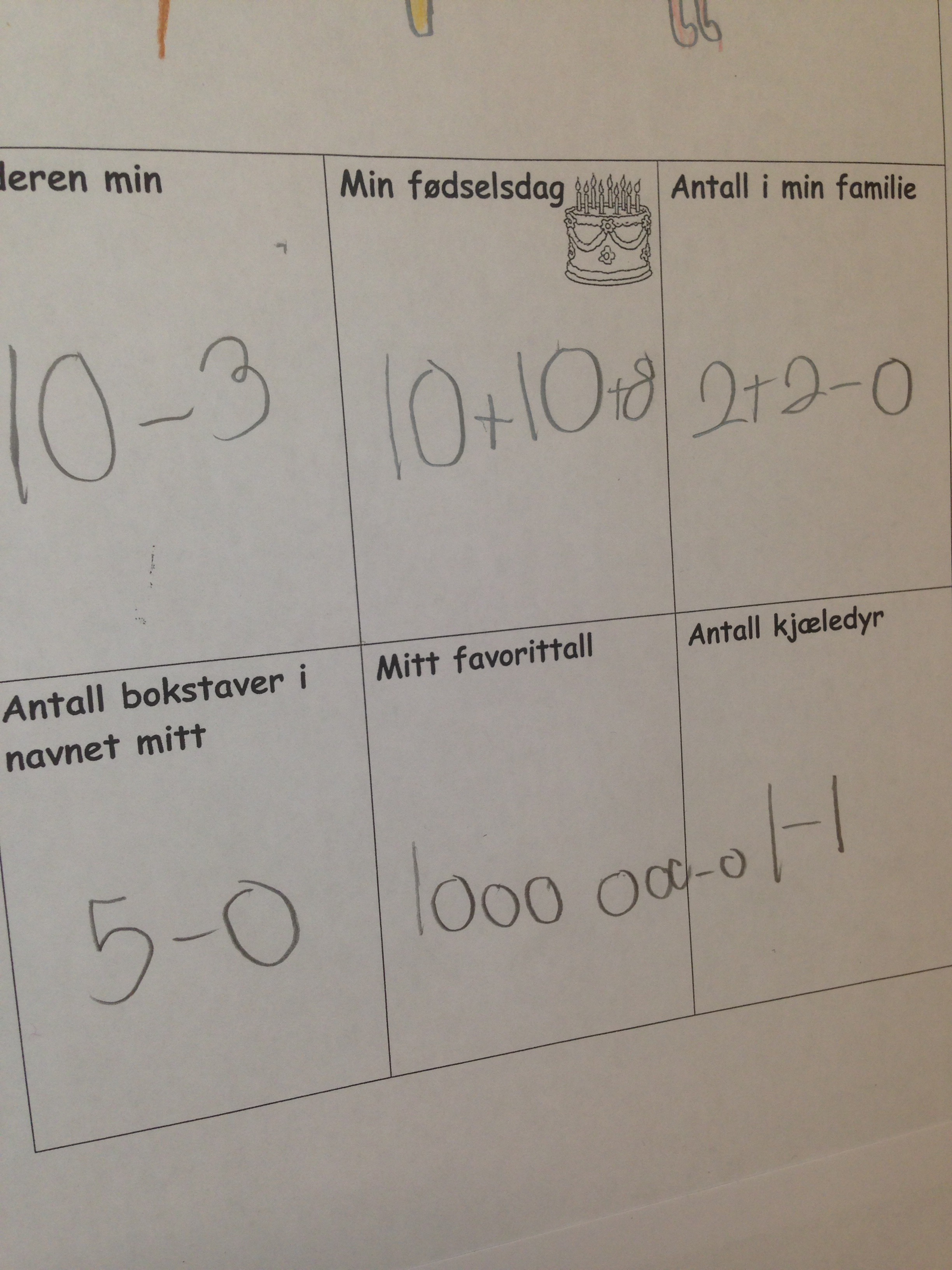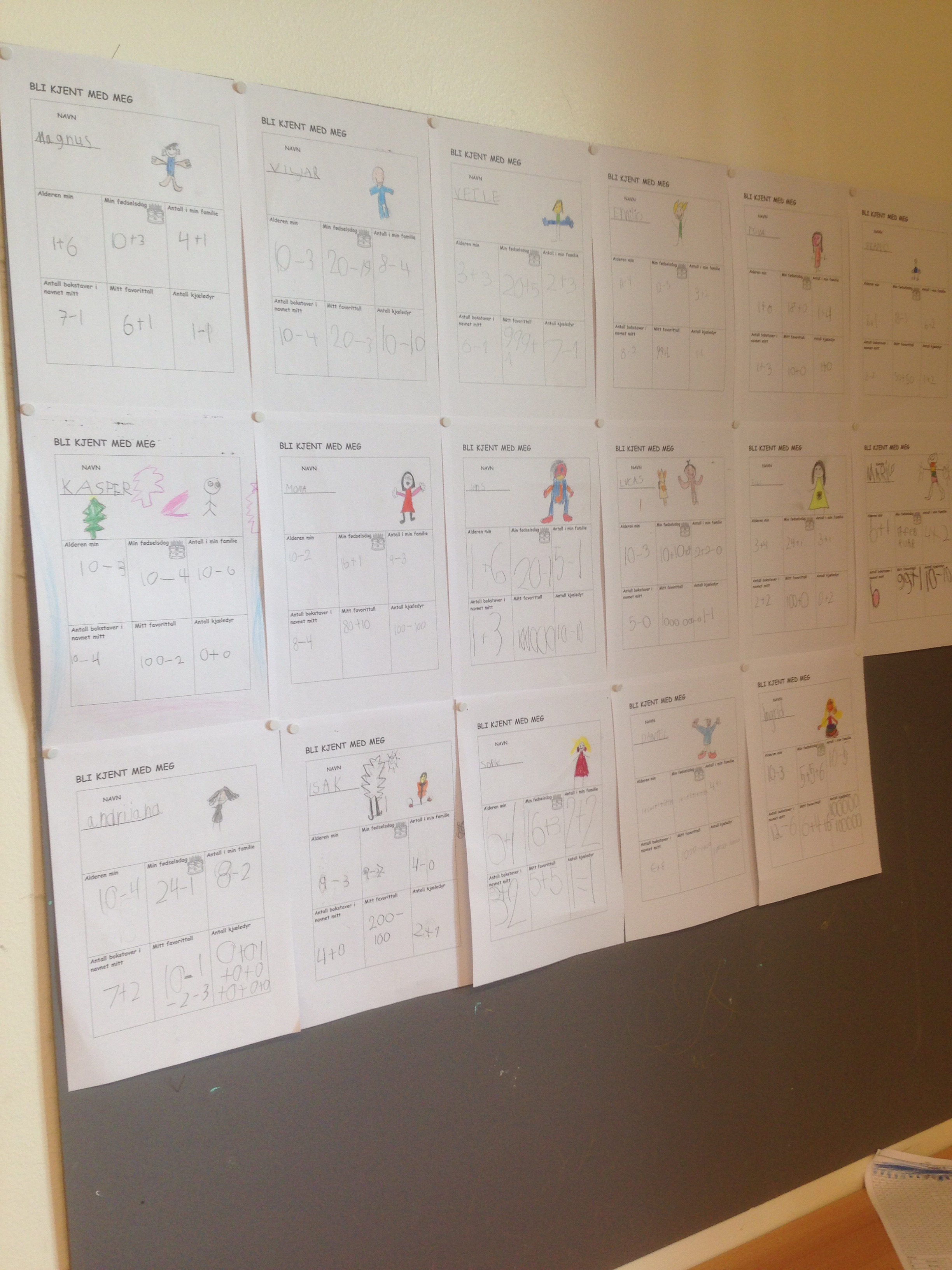 Elevene fikk utdelt et ark: Bli kjent med meg. Her skulle de gi ulike opplysninger om seg selv som alder, bursdagsdato og antall medlemmer i familien. Aberet her var at det ikke var lov å skrive svaret, men at elevene måtte lage et regnestykke som ga riktig svar. Her ble det brukt ulike regnearter som addisjon, subtraksjon og multiplikasjon og noen av regnestykkene inneholdt flere ledd. Dette var en morsom oppgave som engasjerte elevene. Nå er alle arkene hengt opp på veggen slik at andre kan gå å finne ut ulike ting om sine medelever ved å regne ut regnestykkene.