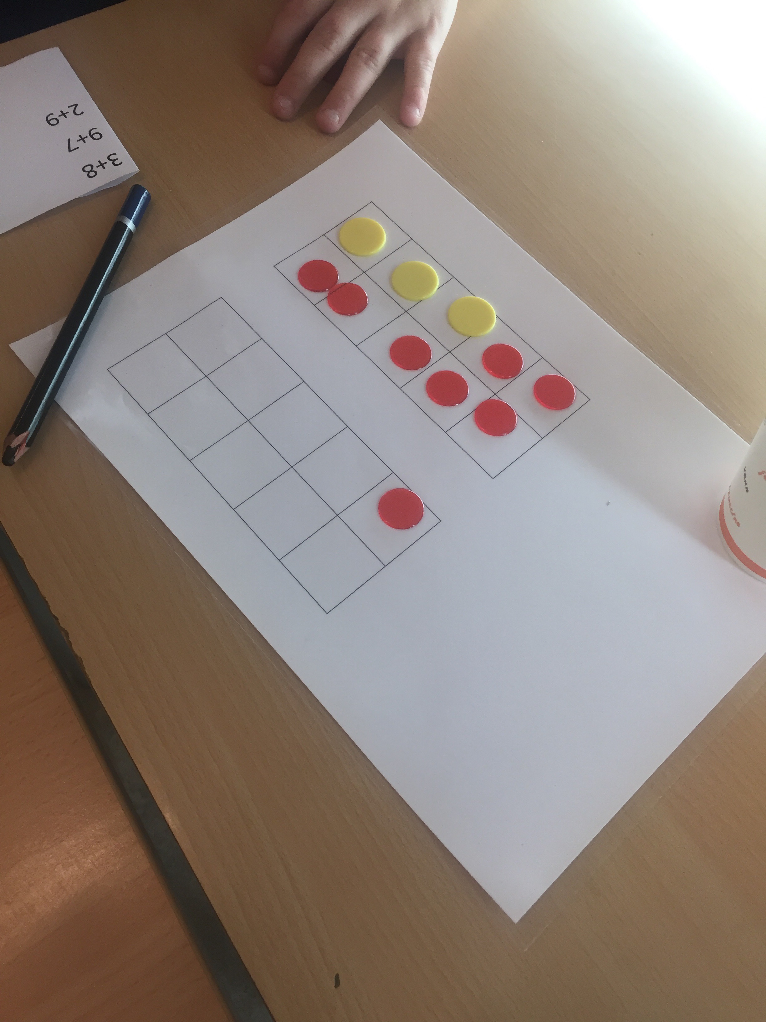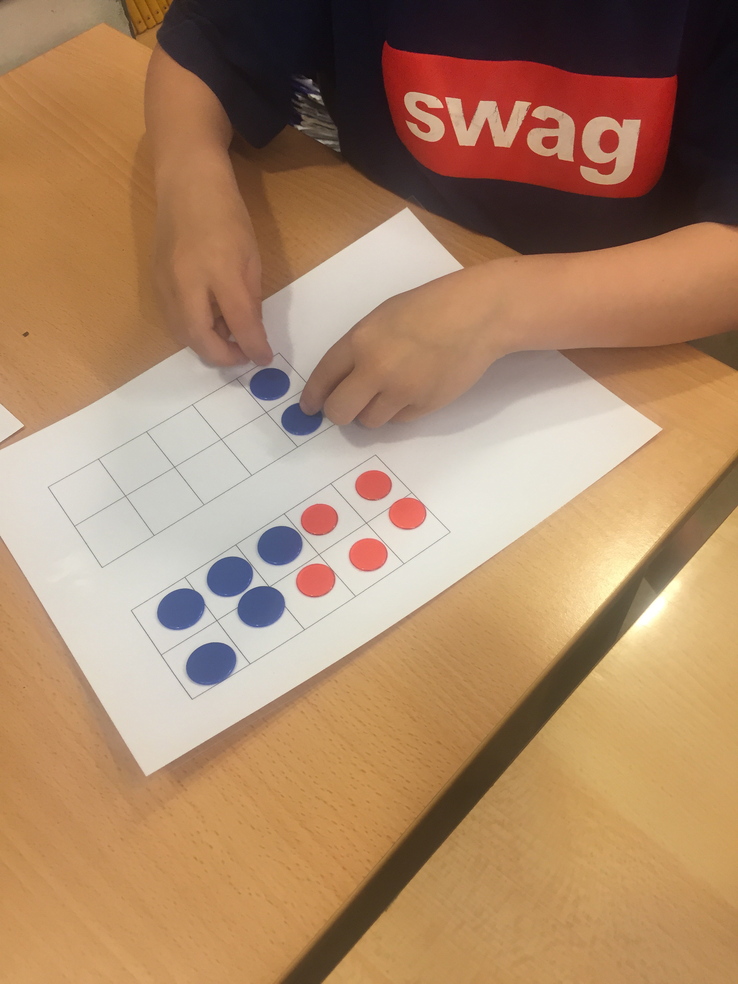 Elevene brukte tierbrett og fikk utdelt brikker og ulike addisjonsstykker. De fikk i oppgave å vise regnestykkene på tierbrettene ved hjelp av brikker i to ulike farger. Noen brukte litt tid på å forstå at det var ti når tierbrettet var fullt, men dette fikk jeg forklart grundigere til de som trengte det da jeg gikk rundt og veiledet.