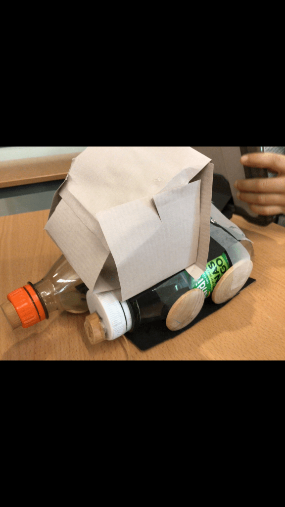 Først fikk elevene utdelt hver sin læringspartner. Sammen skulle de snakke gjennom kriteriene og tegne en arbeidstegning hvor de viste hvordan de hadde tenkt. Utgangspunktet for farkosten var to tomme plastflasker og jeg hadde lagt frem ulike materialer de kunne bruke i tillegg. Da de var klare, kunne de begynne å bygge farkosten. Jeg ble imponert av hvor kreative elevene var. Noen var opptatt av stabilitet slik at den ikke skulle velte, andre tenkte tyngde for å få opp farten, mens andre igjen var opptatt av å hvor figurene kunne plasseres for ikke å falle av.