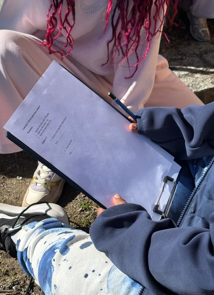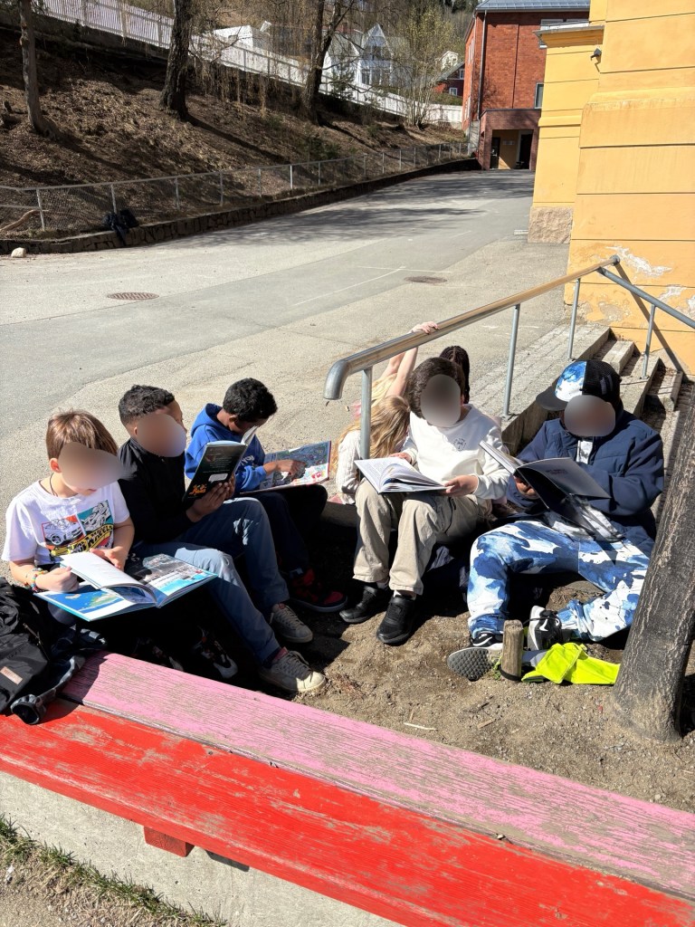 Jeg har blandet inn litt matematikk i lesinga. I går hadde vi uteskole hvor eleven første skulle løse et mysterie hvor de både måtte lese og bruke sine kunnskaper om kilo og gram for å finne løsningen. Jeg hadde tatt med bibliotekbøkene til eleven ut, så da de hadde løst mysteriet, ble det lesing ute. Dette koste elevene seg skikkelig med.