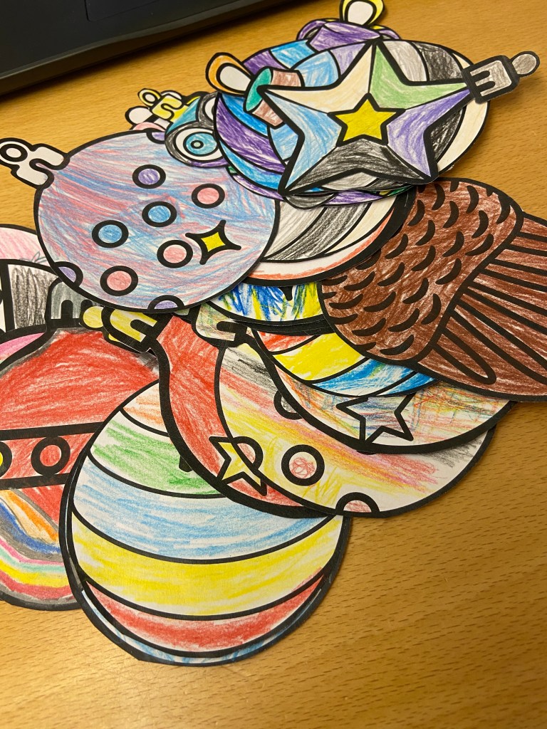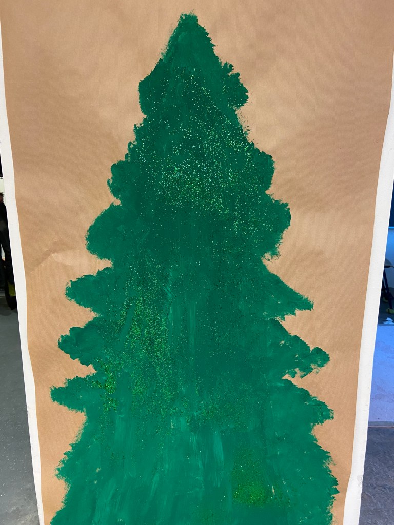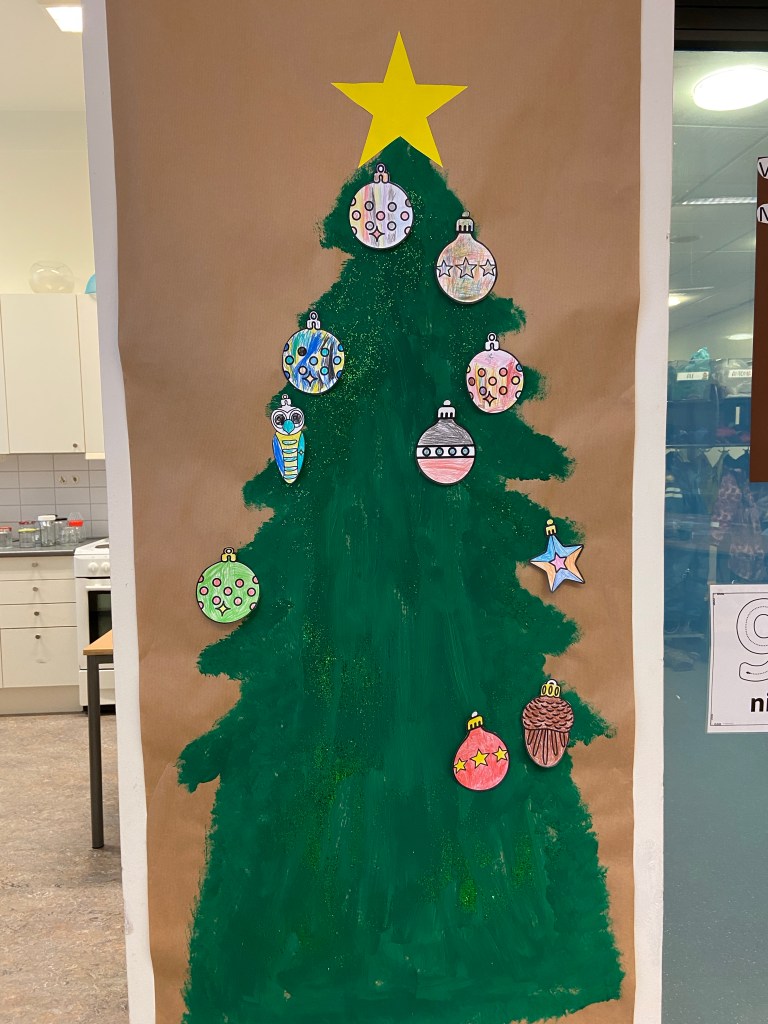 Vi har malt et stort juletre på ett gråpapir og alle elevene har i forkant fargelagt to ting de kan pynte juletreet med.