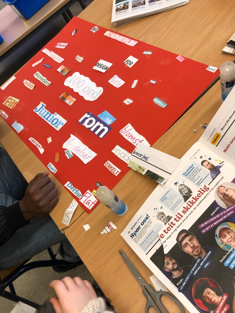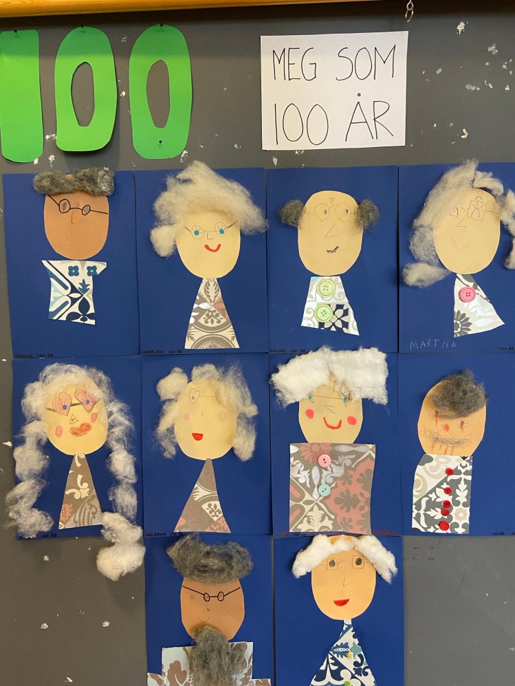 Vi pynter klasserommet til fest. I går lagde elevene portrett av hvordan de trodde de ville se ut når de blir 100 år.