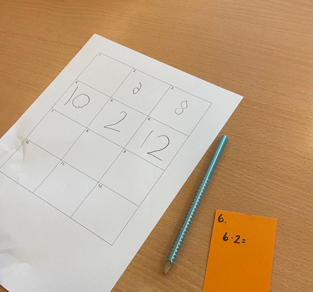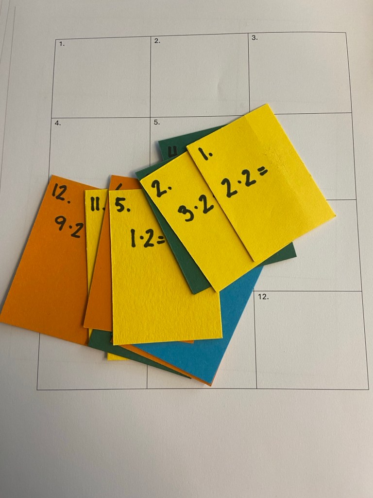 Jeg legger ut en nummerert oppgave på hver pult. I dag var det 2-gangen. Deretter fikk elevene utdelt hvert sitt ark med oppgavenummer fra 1 til 12 (12 fordi det er 12 pulter i klasserommet. Du lager etter antallet du har). Alle skulle starte å løse oppgaven på sin pult og skrive svaret inn i riktig oppgaverute på arket sitt. Når jeg sa «RITT» skulle de bytte plass. De som satt på pulten med oppgave 1 skulle gå til pult med oppgave 2 osv. Etter at alle hadde løst alle oppgaven, gikk vi gjennom svarene i fellesskap.