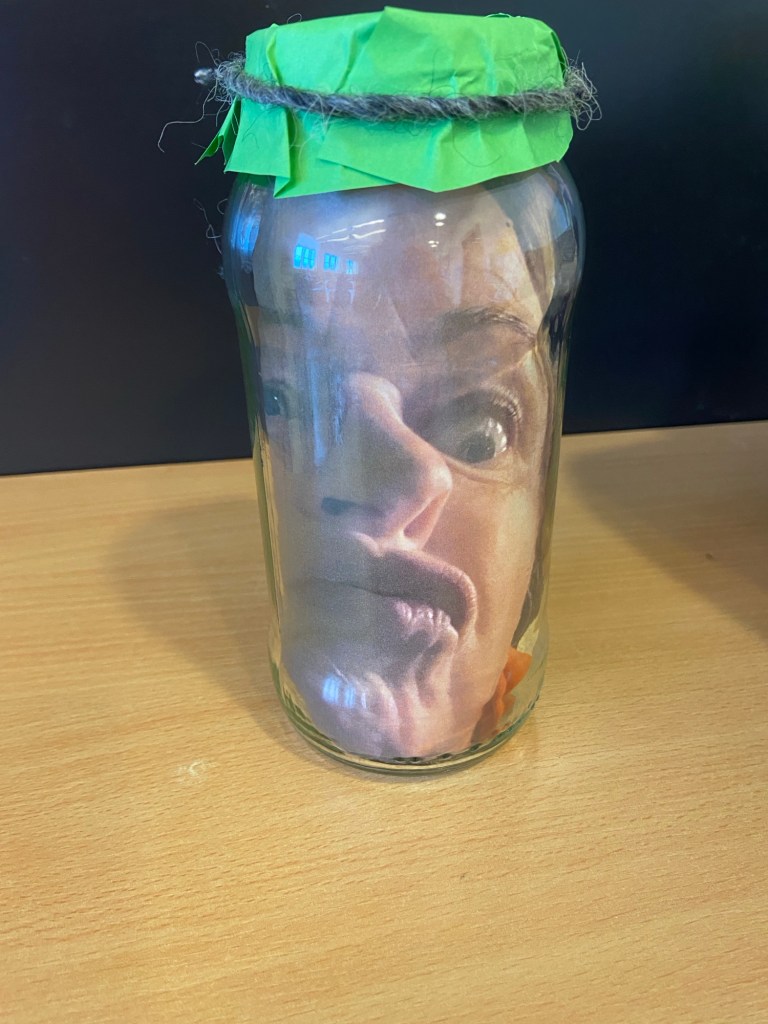 Etter at de var laminert, klipte elevene dem ut før de limte på øyne og tenner/munn.
