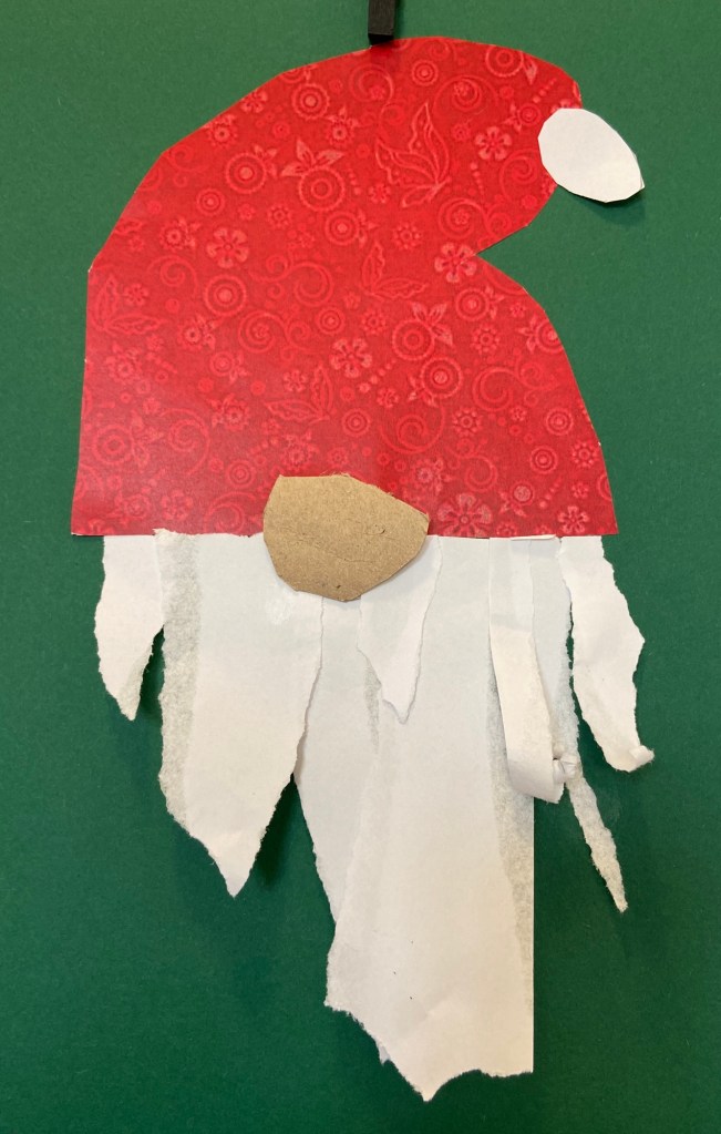 2.trinn har lagd nissehoder. De klipte ut lue og limte på dusk, deretter rev de papir som de brukte til skjegg. Til slutt lagde de nese som ble limt på.