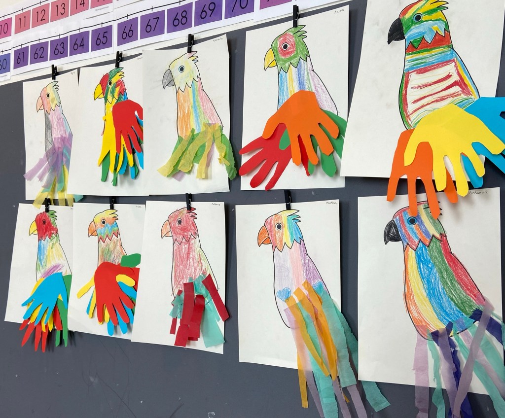 Elevene fargela først papegøyen. Deretter kunne de velge om de ville lage fjærene med silkepapir eller med farget papir hvor de klippet ut omriss av fingrene.