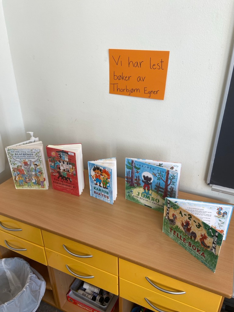 Vi jobber med Thorbjørn Egner som tema. Elevene synes det er kjempemorsomt og dette er et tema som fenger. Temaet skal ende i en utstilling for foresatte med elevarbeider og en liten forestilling med noen sanger.