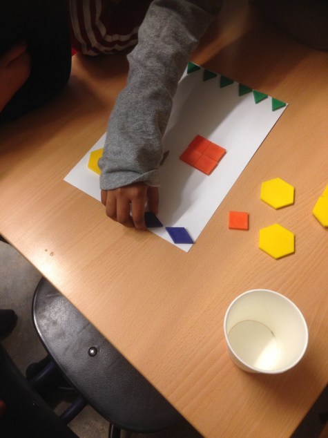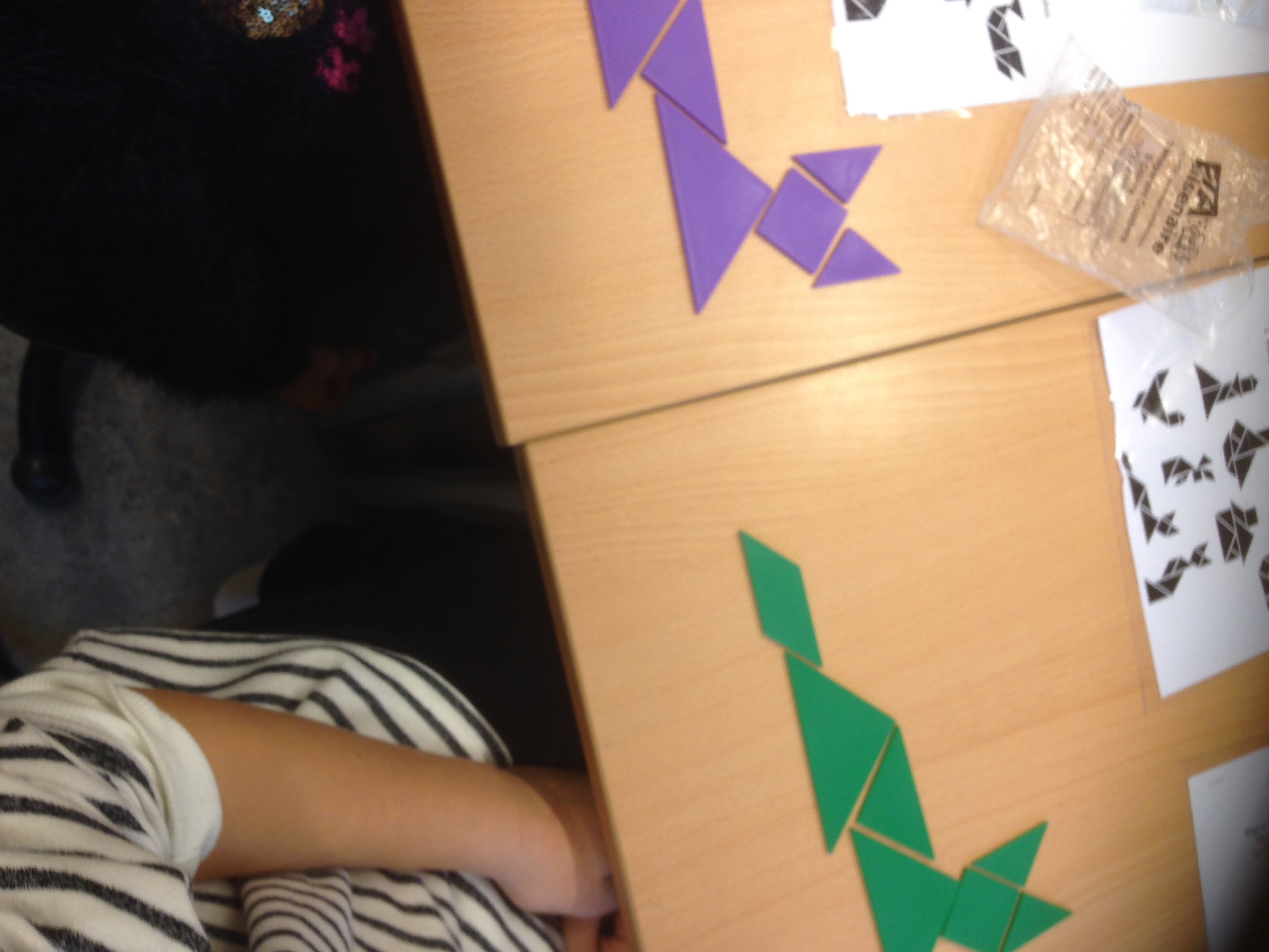 Som jeg skrev i forrige blogginnlegg, startet vi dagen med stasjoner sammen med fadderne. Gruppene var gjennom fire ulike stasjoner. Jeg hadde ansvaret for en stasjon hvor elevene jobbet med TANGRAM. Elevene puslet figurer, både etter bilder hvor brikkene syntes og etter bilder hvor man kun så omrisset av figurene. Slik ble det enkelt å differensiere oppgavene til de ulike elevene.