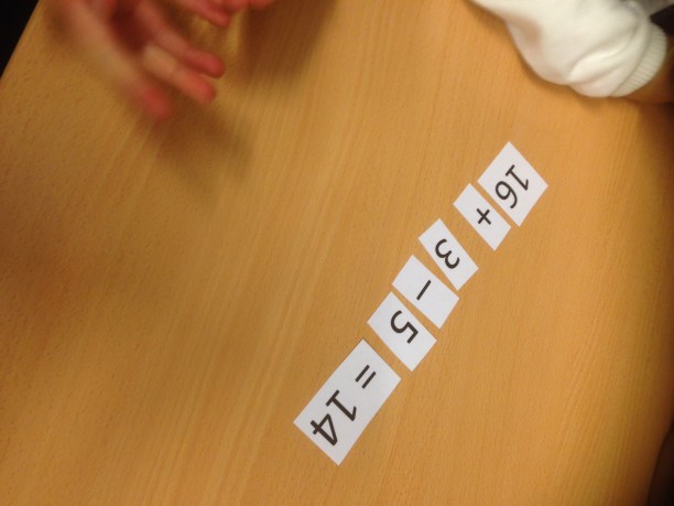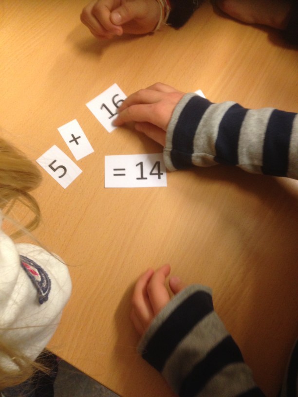 Elevene var fortsatt delt inn i to lag. Jeg hadde lagt ut massevis av regnestykker i gangen og elevene skulle etter tur løpe ut, hente seg et regnestykke, regne ut og legge regnestykket ved riktig svar. Deretter var det nestemann sin tur, og slik fortsatte det til alle lappene med regnestykker var brukt opp.