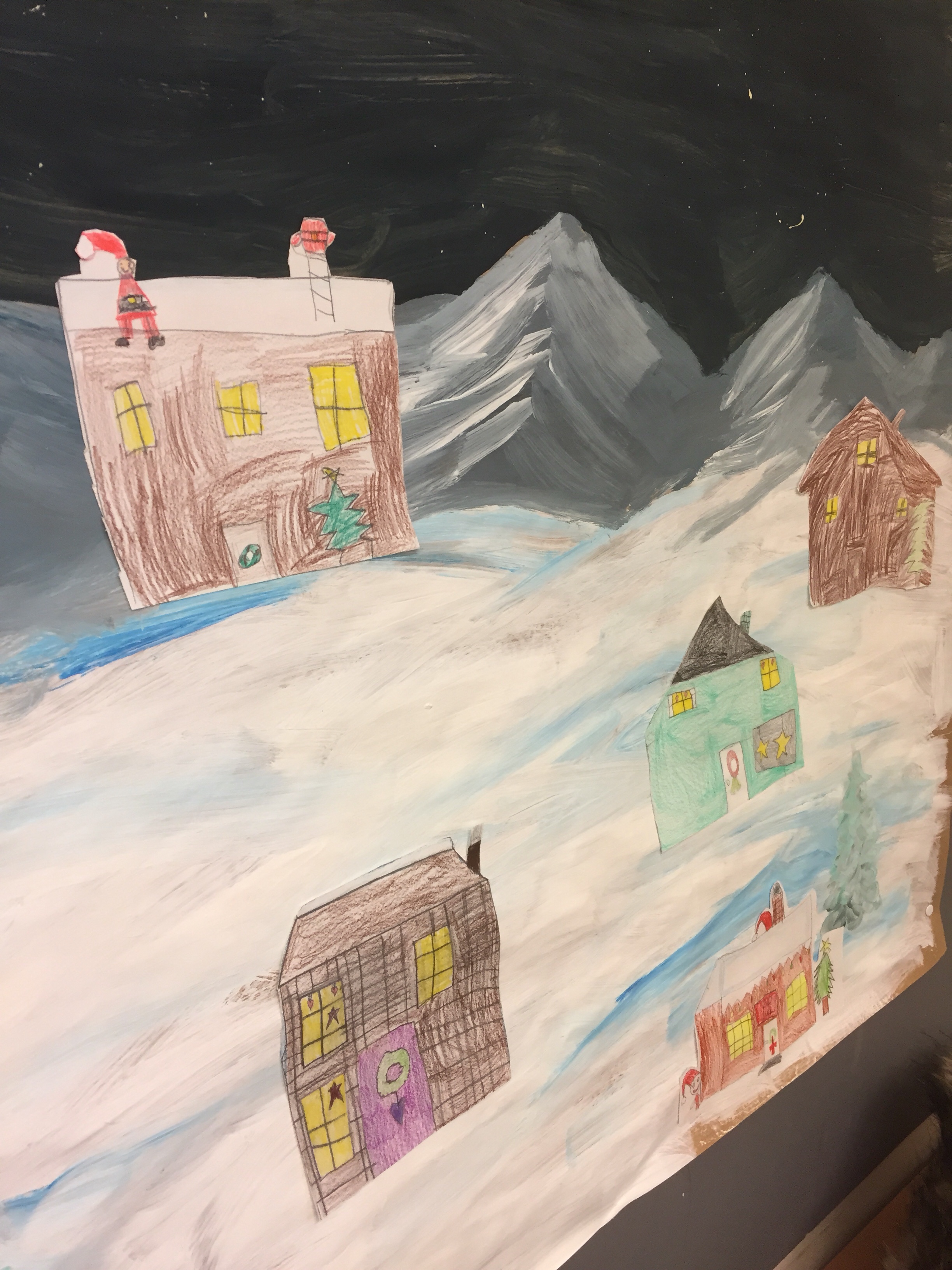 I år er kalenderen en julelandsby. Alle elevene har på forhånd tegnet et julehus hver og lagt det i navnet konvolutt. På forhånd har vi voksne malt en vinterbakgrunn som er hengt opp på veggen.