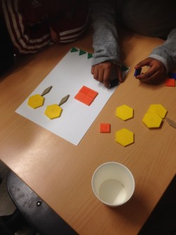 Dette var en veldig morsom aktivitet og elevene fikk trent både hukommelse, geometriske begreper, den romlige intelligensen og ikke minst å forklare og kommunisere med det matematiske språket. I starten syntes elevene det var vanskelig å formidler det de hadde observert videre til nestemann, men etter hvert tok de i bruk begreper som trekant, firkant, høyre, venstre, oppe, nede, kant og midten, og da gikk det lettere. Alle gruppene klarte å legge brikkene riktig.
