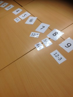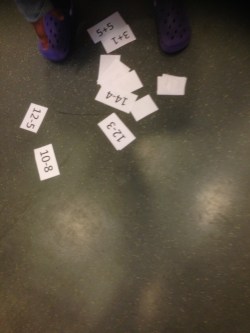 Elevene var fortsatt delt inn i to lag. Jeg hadde lagt ut massevis av regnestykker i gangen og elevene skulle etter tur løpe ut, hente seg et regnestykke, regne ut og legge regnestykket ved riktig svar. Deretter var det nestemann sin tur, og slik fortsatte det til alle lappene med regnestykker var brukt opp.