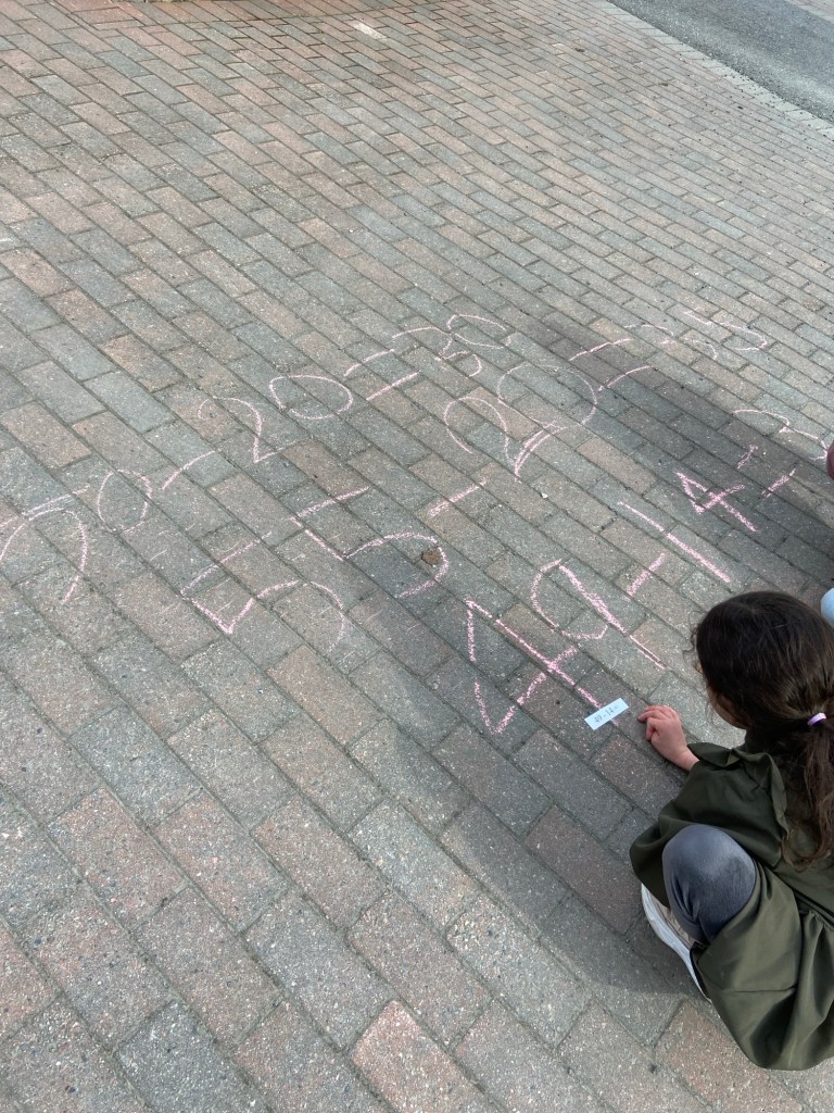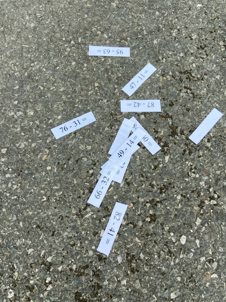 Jeg la utover masse subtraksjonsstykker på asfalten. Læringsparet valgte ett og ett, og regnet ut på asfalten. De kunne selv velge hvilken strategi de ville bruke. De fleste regnet ut med oppstilt subtraksjon eller brukte strategier som først enerne, så tierne. Vi har jobbet en del med tom tallinja, men ingen valgte denne strategien, så den er de nok ikke trygge nok på enda.