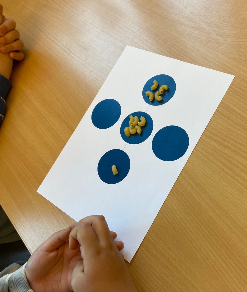 Hvert læringspar fikk utdelt 15 makaroni og et ark med sirkler som skulle forestille fem boller.