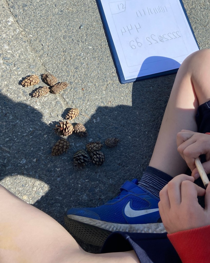 Elevene (2.trinn) ble delt inn i læringspar og første oppgave var å finne 12 kongler. Disse skulle de bruke til å løse oppgaven.